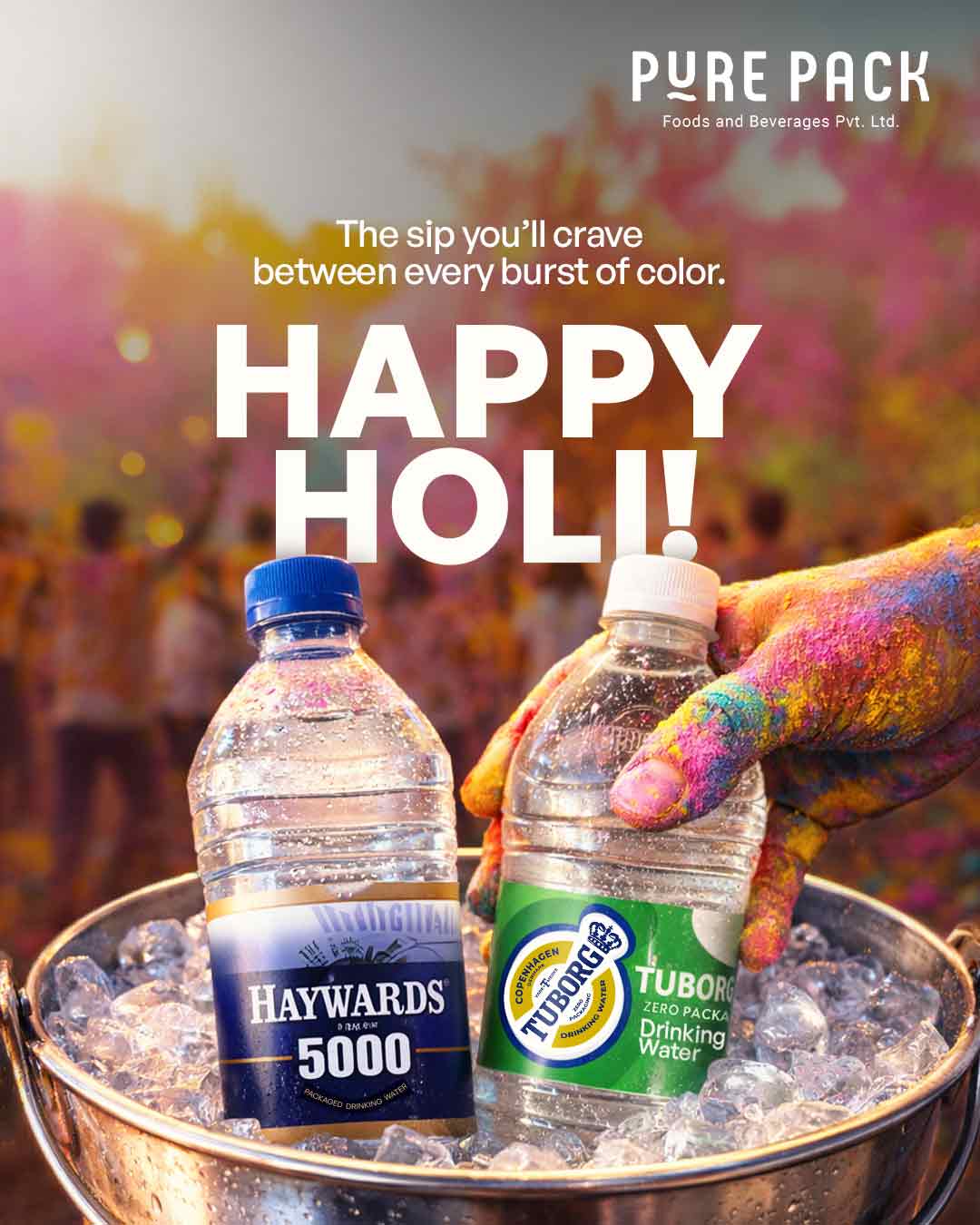 The visual juxtaposes colour-covered hands reaching into ice for chilled bottles, capturing the contrast between festive chaos and refreshing calm. The copy, “The sip you’ll crave between every burst of color,” anchors the idea.